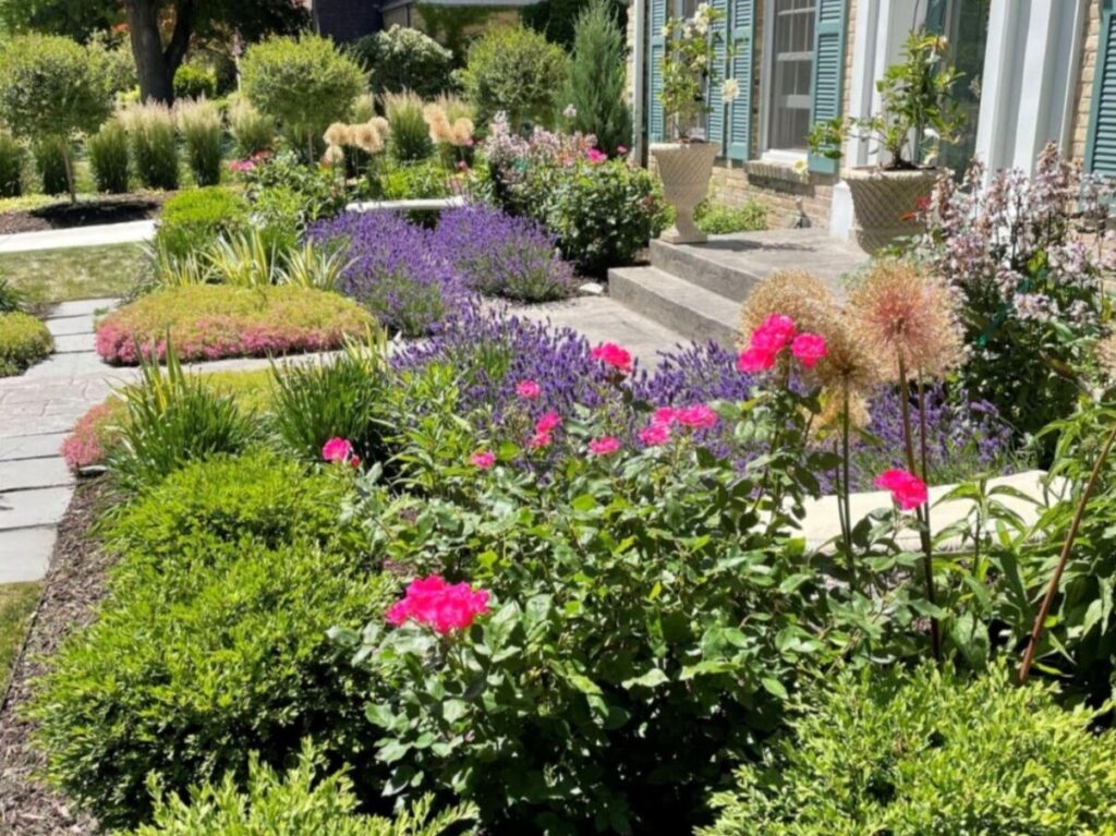 May to June in this Wauwatosa front yard brings exciting transitions as timed blooms move through the garden. This formal planting — accented with bluestone steppers and lavender-lined aggregate pathways — was designed and installed by Bloom! Landscaping. Cast-stone benches offer the owners places to enjoy changing garden views, while ornamental grasses and dwarf lilacs on standard add texture, screening, and four-season curb appeal.